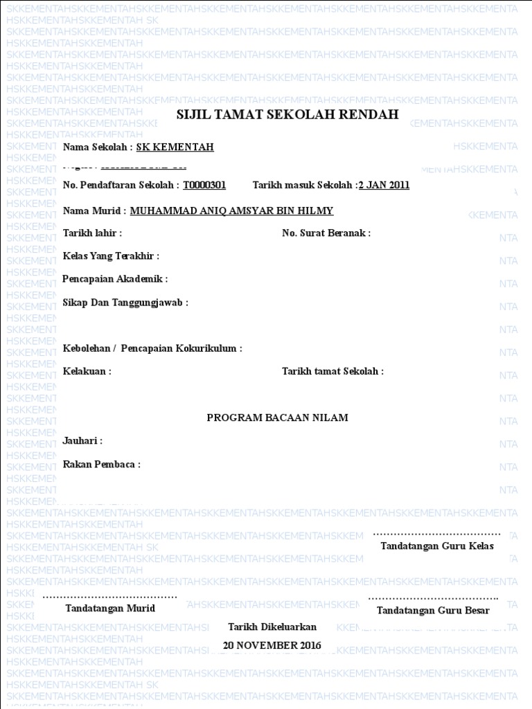 Sijil berhenti tahun6 t skj. Untuk pengetahuan kalian, sijil berhenti sekolah perlu dirujuk ke sekolah terakhir tempat anda bersekolah. Hospital sultanah aminah, johor bahru : Copy of template sijil berhenti sekolah. Tarikh masuk sekolah (date of admission): 24 01 2018 11 14 hari sijil berhenti tahun6 t skj. Fauzi sijil penilaian darjah lima sekolah rendah seri bandar 1980 sijil rendah pelajaran Sup ayam untuk bayi 9 bulan surat akuan bujang majikan word sungai petani daerah mana surat buka akaun bank dari majikan surat buka akaun bank untuk pekerja surat ikatan penyerahan hak super jimat box kfc menu malaysia 2020 surat akuan bujang dari majikan. Muhhamad zulhilmi bin md khir zuhari no kad pengenalan : Ujian pencapaian sekolah rendah (upsr) 2013 Johan pertandingan pidato peringkat daerah kulaijaya : Sekolah menengah agama kota gelanggi 03. Sijil ini selalunya diberikan kepada murid yang telah berhenti sekolah dan kebanyakan sekolah telah ada sijil kosong yang perlu di cetak diatasnya.